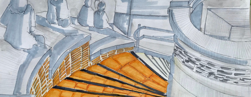 En el segundo ves la luz y la sombra en diferentes puntos del dibujo, además se centra en las piedras del suelo y de los lados de la escalera. También se ve lo que está representado como que está más cerca y más lejos según las personas.